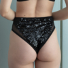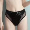 High-waisted bottoms with a sculpting silhouette and high-leg cut to elongate the body. The design frames the waist while offering a secure and comfortable fit. Crafted from a combination of glitter fabric, base material, and sheer mesh panels, creating a clean contrast with a light, refined finish. The construction allows full freedom of movement while maintaining stability during practice. A sleek, structured design with a smooth, flattering back cut and soft shine. Enhances every movement with a luminous, light-catching finish that comes alive under studio and stage lighting – suitable for stage performances, competitions, training sessions, and after-class evenings.