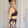 PAULA garter belt is an elemental accessory piece that will elevate every look. With a combination of a see-through mesh and intricate heart-shaped detailing that hugs your legs and snatches your waistline. It leaves your behind open to accentuate the bottoms that you wear. It is a perfect piece to elevate to your performance attire or an add-on to your intimate styling.
